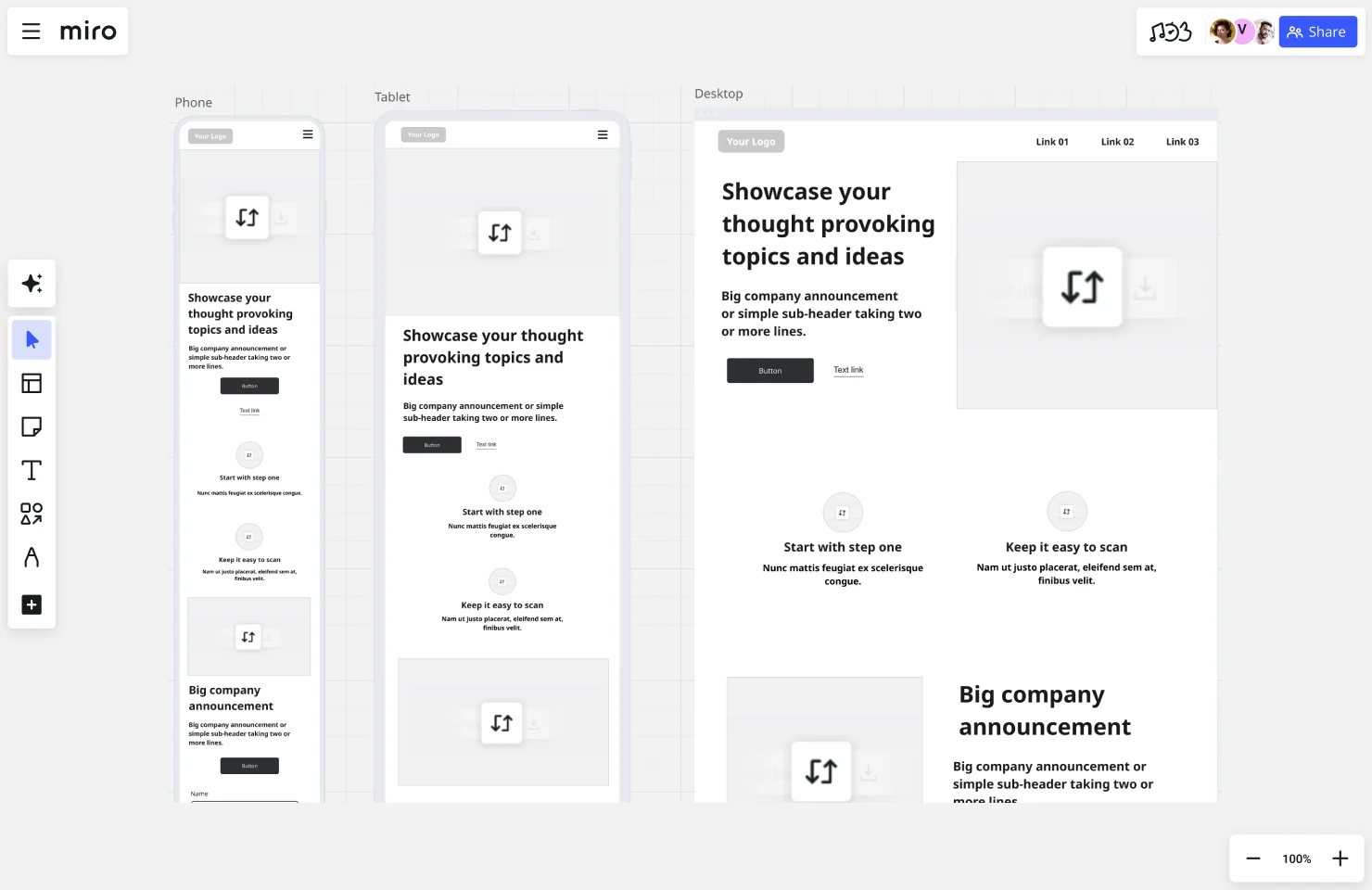Creating a website wireframe is a crucial step, but it doesn't have to be a complicated one. With Miro's innovation workspace, you have everything you need to sketch out your website's structure, collaborate with your team in real time, and iterate faster with tools like Miro AI. And with our extensive library of ready-made templates, building your wireframe is as easy as drag-and-drop.